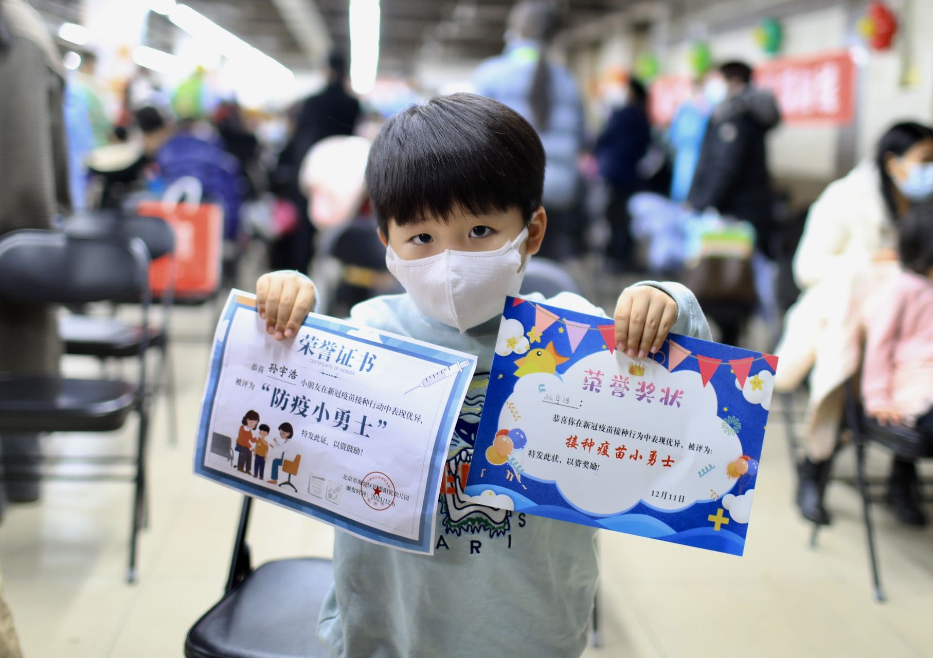 疫苗接种完成后,工作人员给小朋友颁发了荣誉奖状和“防疫小勇士”荣誉证书,家长们也拿起手机,拍照记录下孩子的勇敢时刻。一名家长介绍,她的孩子已经完成第一针的接种,今天来打第二针,“挺好的,保护孩子也保护家人”。
