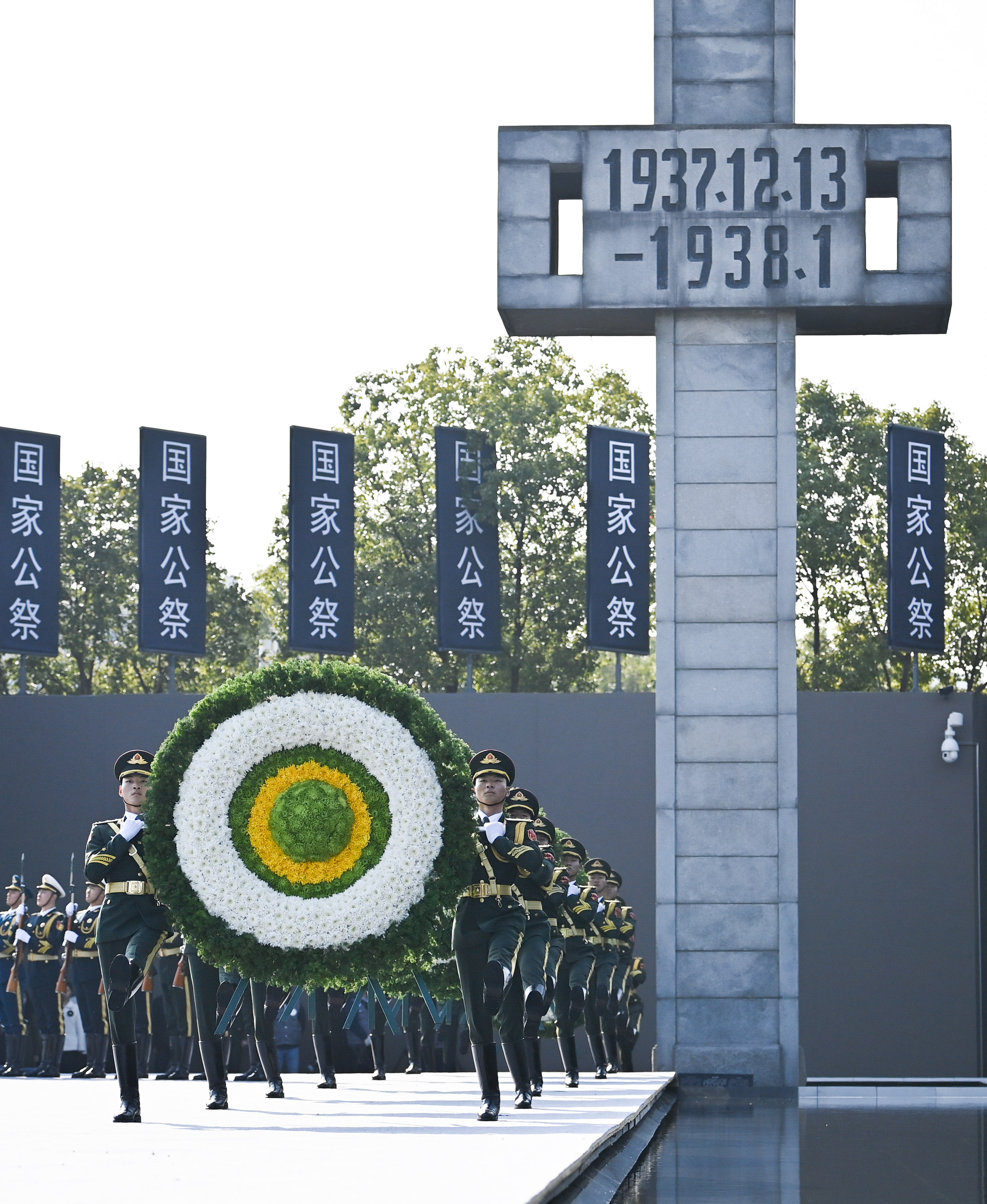 解放军三军仪仗队将花圈敬献于公祭台上,缅怀死难同胞。↓↓↓