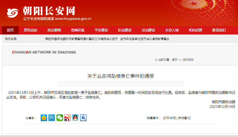 通报称,2021年12月13日上午,朝阳市双塔区恒屹家园一男子坠楼身亡。接到报警后,民警第一时间赶赴现场进行处置。经核实,坠楼者为朝阳市委政法委副书记丛志鸿。目前,公安机关已经确认,死者为坠楼身亡,排除他杀。