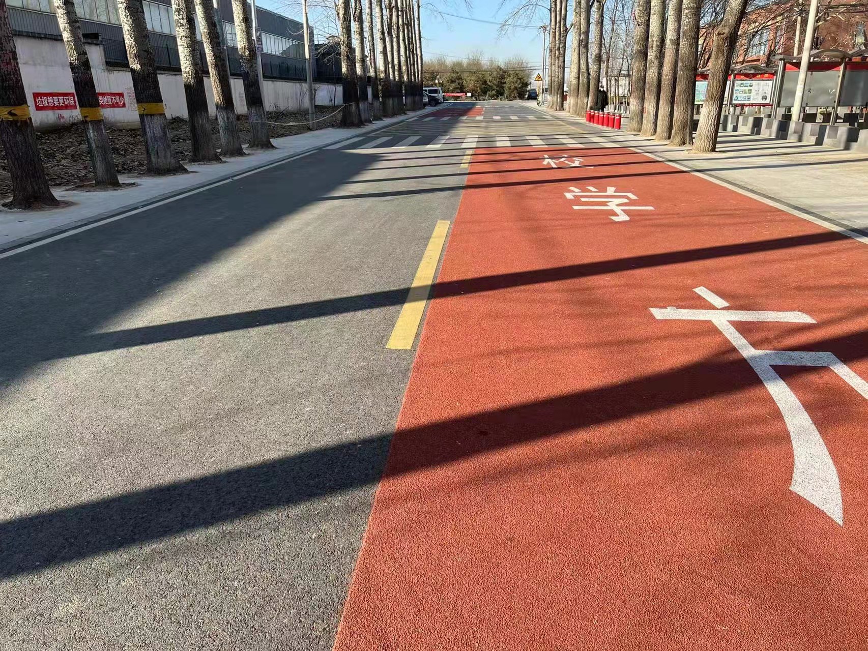 杨镇沙岭学校路位于沙岭学校南侧,是学生上下学的主要通道,原道路存在龟裂、沉陷、基层松散强度不足等问题,影响通行的舒适性和安全性。为此,顺义公路分局将原4米至6米宽的道路加宽到5米至9米,对路床进行掺灰处理以提高路床强度,将道路结构由原来的两层增加到五层,并在道路两侧增加硬化路肩,改善了道路通行环境,大幅提高了道路承载力。同步增设薄层铺装彩色路面,并施划“前方学校”地面文字,在校门口施划黄网格线交通标线,提高了学校周边交通设施设置标准,提升了道路通行安全性,温暖了学校师生和学生家长的心。