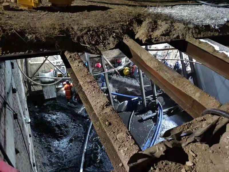 16日23时许,记者在现场看到,救援人员已开凿出三个救援出口,在距地面约40米的巷道上进行抽水作业。