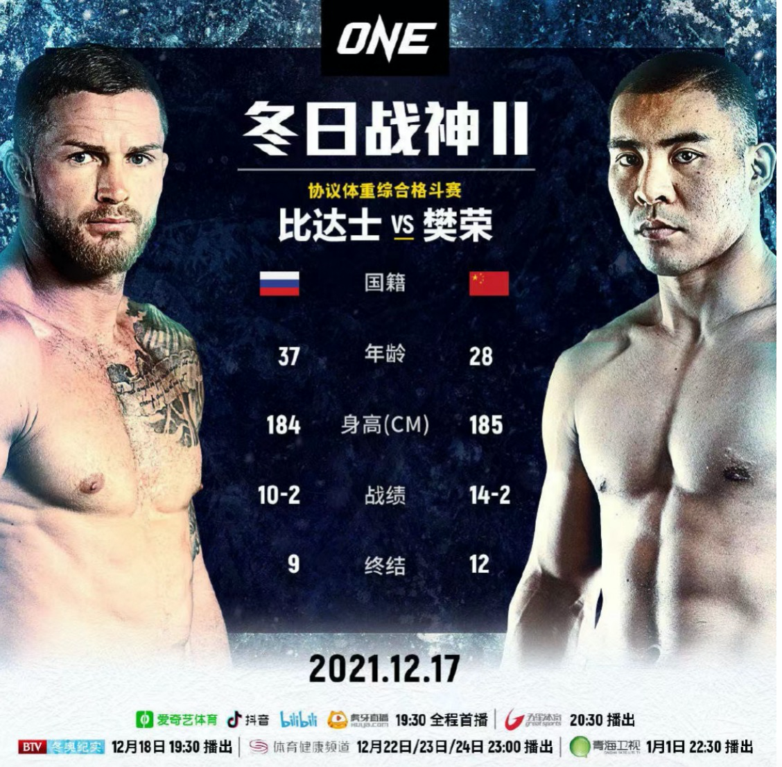 新京报讯(首席记者 孙海光)由国际知名体育IP-ONE冠军赛举办的“ONE:冬日战神II”大型格斗赛事将于12月17日19点30分播出。本期赛事由9场高水平对决组成,头条主赛由前蝇量级世界冠军凯拉特·艾哈迈托夫迎战世界排名第二的丹尼·金加德。同时,前雏量级世界冠军凯文·贝灵刚、中国选手樊荣与李凯文也将出战本次赛事。