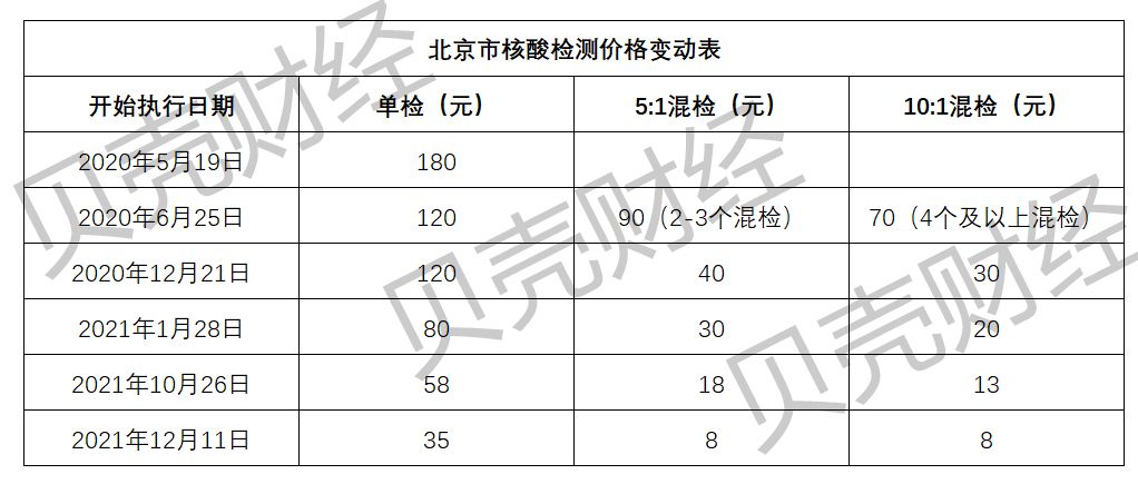 贝壳财经记者梳理看到,新冠疫情暴发以来,北京市对新型冠状病毒核酸检测项目的价格已经进行多次调整,2020年5月时,单检价格为180元/次,一年半时间,逐步降低至35元/次,混合检测价格跌破10元。