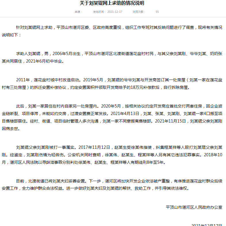 12月17日,平顶山市湛河区发布关于刘某锟网上求助的情况说明。网页截图