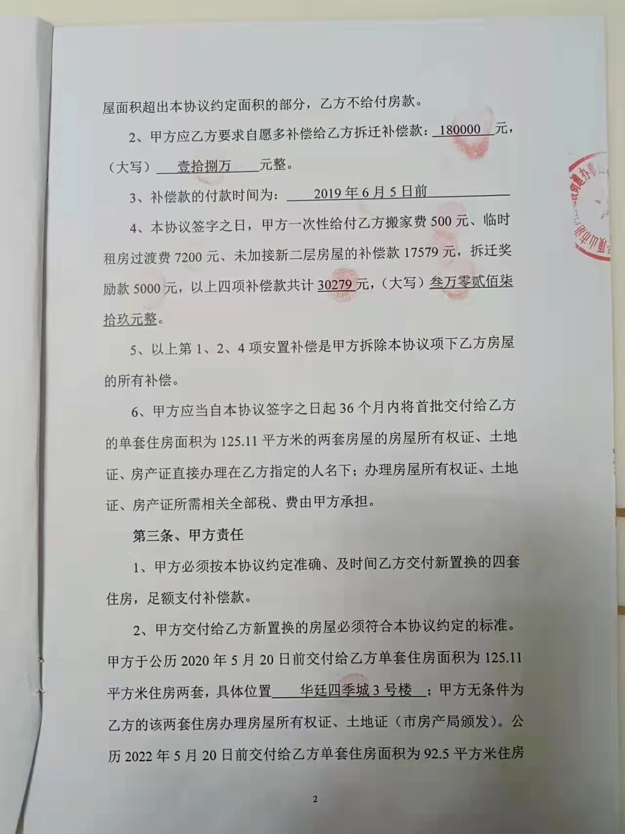 刘某锟一家与开发商签订的协议显示,开发商承诺还建4套住房,分别在华廷四季城1期的3号楼和5号楼,其中两套面积为95.2平方米,另外两套面积约125平方米,还有补偿款18万元。还建房将于2020年5月和2022年5月交付。受访者供图