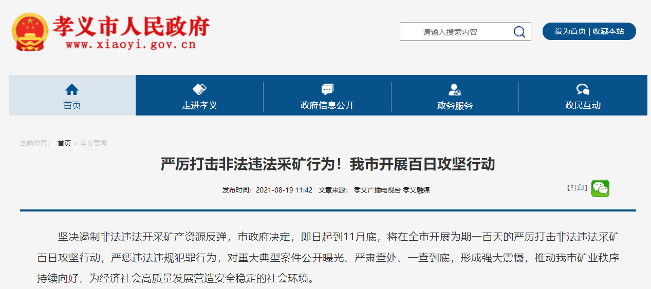 ▲今年8月中旬到11月底,孝义市政府在全市开展为期一百天的严厉打击非法违法采矿百日攻坚行动。图/孝义市人民政府网截图
