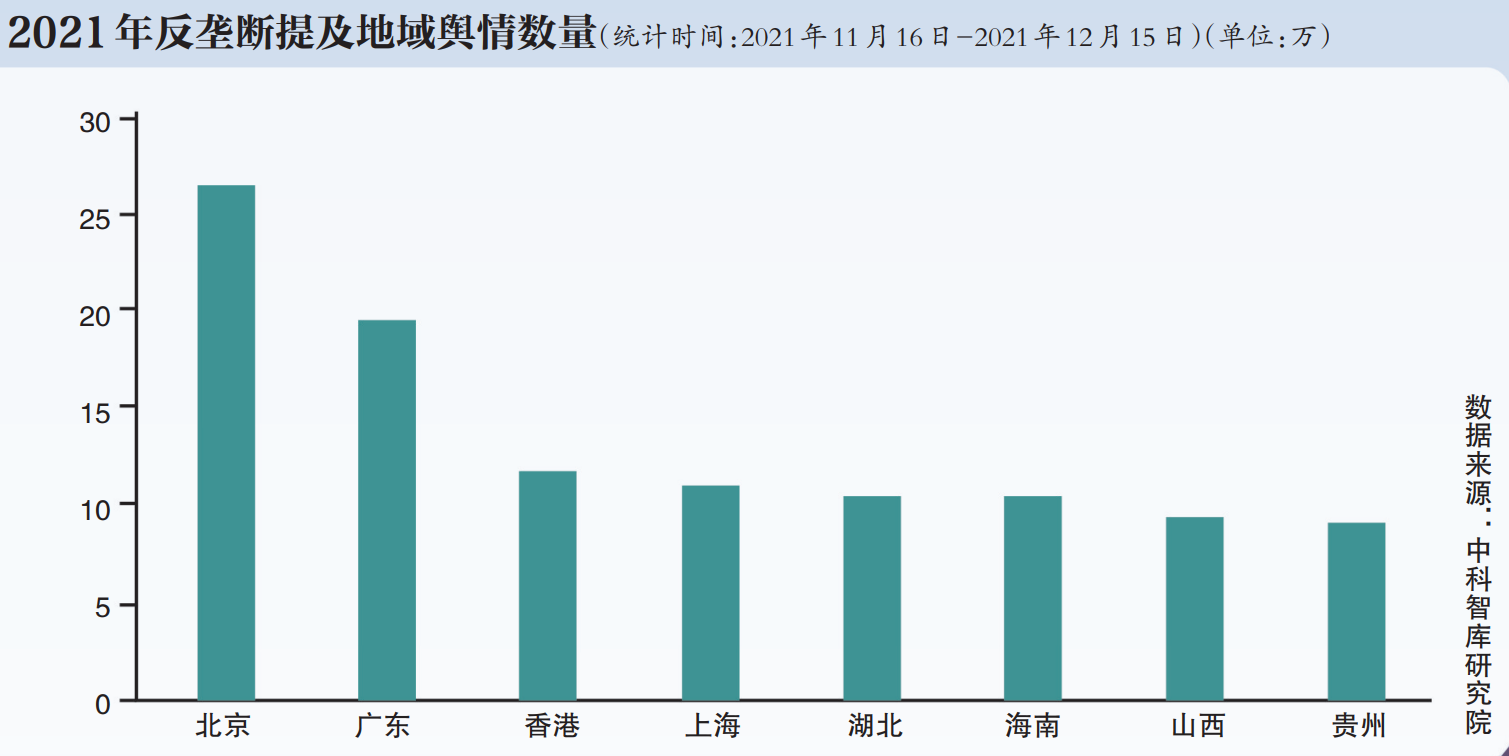 从地域角度分析,在最近一个月时间范围内(11月16日-12月15日),涉及反垄断的相关新闻中,提及地域以北京、广东数量最高,其后的香港、上海、湖北及海南等地数量较为接近,均超过10万条数据。