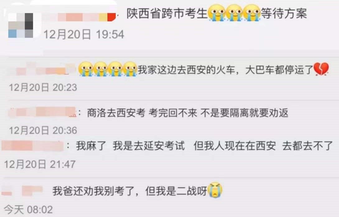 据华商报报道,西安多所高校已对考研学生申请借考等信息进行摸排登记,但截至12月20日下午,仍无确切安排,多名学子称有些担心。华商报记者3次拨通陕西省教育考试院官网电话,前两次一直占线,最后一次无人接听。目前,西安仍处于疫情防控的关键时期,防疫形势尚未明朗、防控压力较大。一些学校,还有一些小区正处于封闭管理的状态,相当一部分考生无法出来。尤其是长安大学,形势尤为严峻。据澎湃新闻报道,12月19日起,雁塔区小寨路街道长安中路33号长安大学校本部住宅区和北院宿舍区已被调整为高风险地区,且急需防疫物资。受疫情反复、管控措施收紧的影响,能不能及时赶赴考场,能不能按时参加考试,成了备考考生担忧的问题。考虑到考研学子的实际情况,已经准备了近一年的考试,辛苦和努力付出如果被疫情耽误,则会无比遗憾。 ▲考生们在社交平台表示对西安研考工作安排的担心。图/社交平台截图