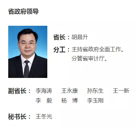 黑龙江省政府官网最新信息显示,省政府领导有:省委副书记、省长胡昌升,省委常委、常务副省长李海涛,省委常委、副省长王永康,副省长孙东生,副省长王一新,副省长、省公安厅厅长李毅,副省长杨博,副省长李玉刚,省政府秘书长王冬光。