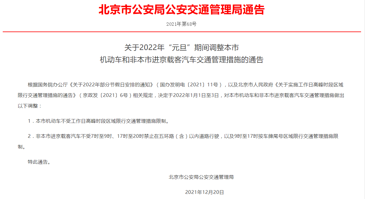 根据国务院办公厅《关于2022年部分节假日安排的通知》(国办发明电〔2021〕11号),以及北京市人民政府《关于实施工作日高峰时段区域限行交通管理措施的通告》(京政发〔2021〕6号)相关规定,决定于2022年1月1日至3日,对本市机动车和非本市进京载客汽车交通管理措施做出以下调整: