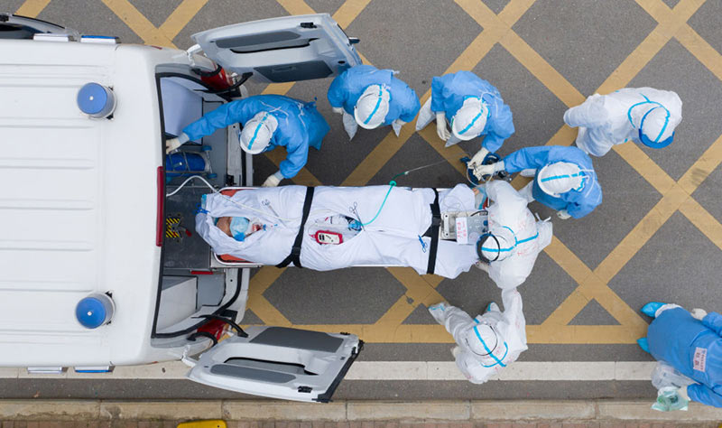 2020年3月6日,在湖北省武汉市的华中科技大学附属同济医院中法新城院区,医护人员用负压救护车转运一位新冠肺炎患者做CT检查(无人机照片)。