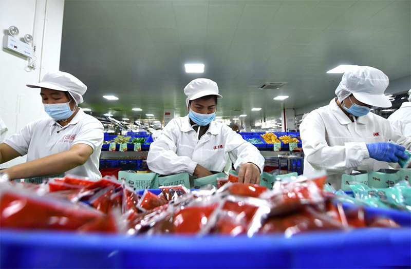 在广西一食品有限公司螺蛳粉生产车间,工人在生产线上包装螺蛳粉。
