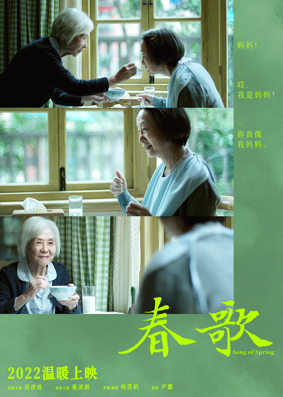影片片名《春歌》取自南宋无门慧开禅师的一首诗偈:春有百花秋有月,夏有凉风冬有雪。若无闲事挂心头,便是人间好时节。诗句与影片中的深刻亲情两相呼应:“春歌”即是一首生命之歌,一首献给母亲的歌。该片讲述了85岁的母亲独自照顾65岁罹患阿尔茨海默症的女儿的故事,两位老人在生命尽头用爱挥洒余晖,照亮彼此的人生。据悉,影片将于2022年正式上映,期待这部影片早日与观众见面。