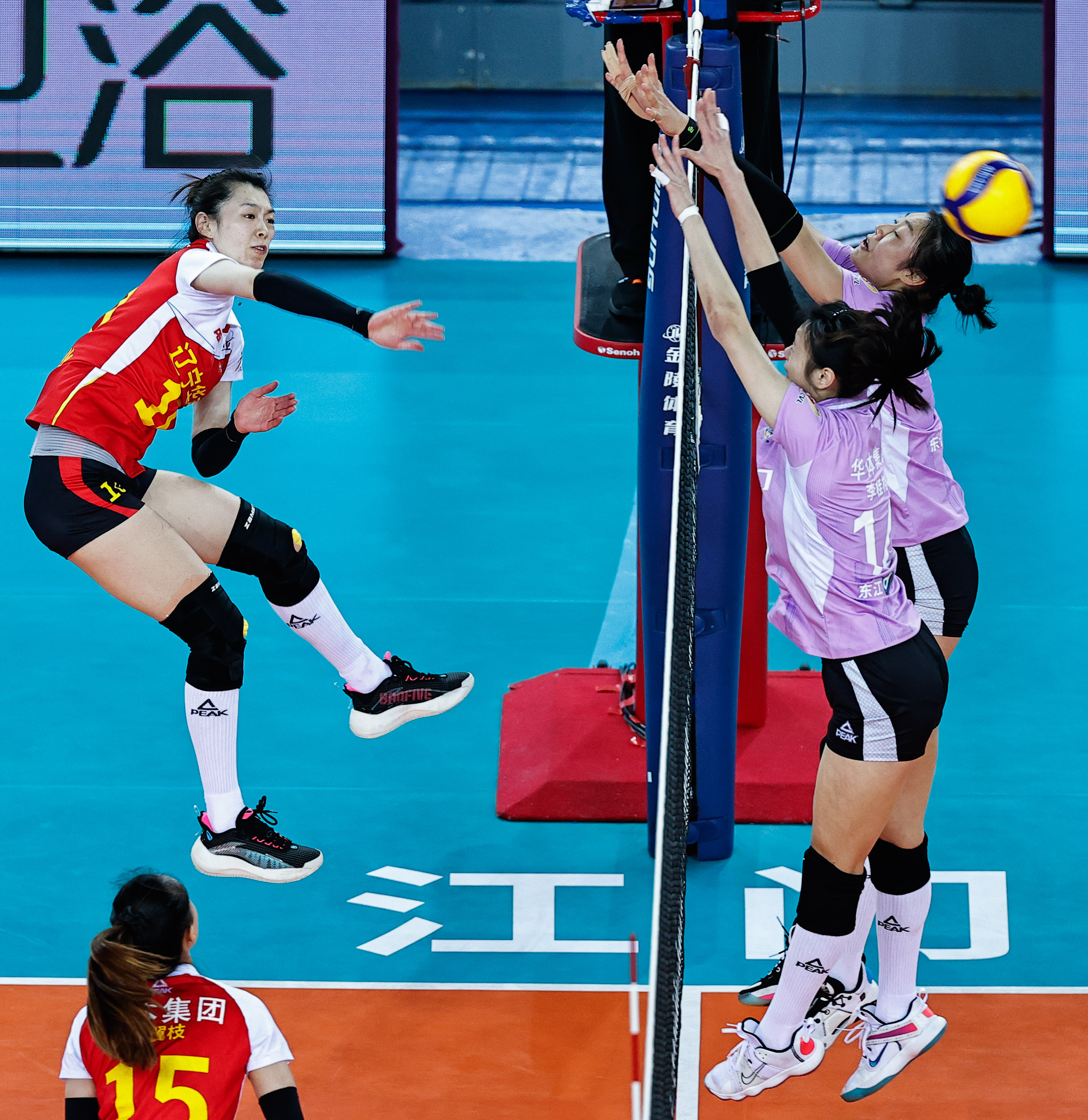 辽宁队段放(左上)在比赛中扣球。图/新华社