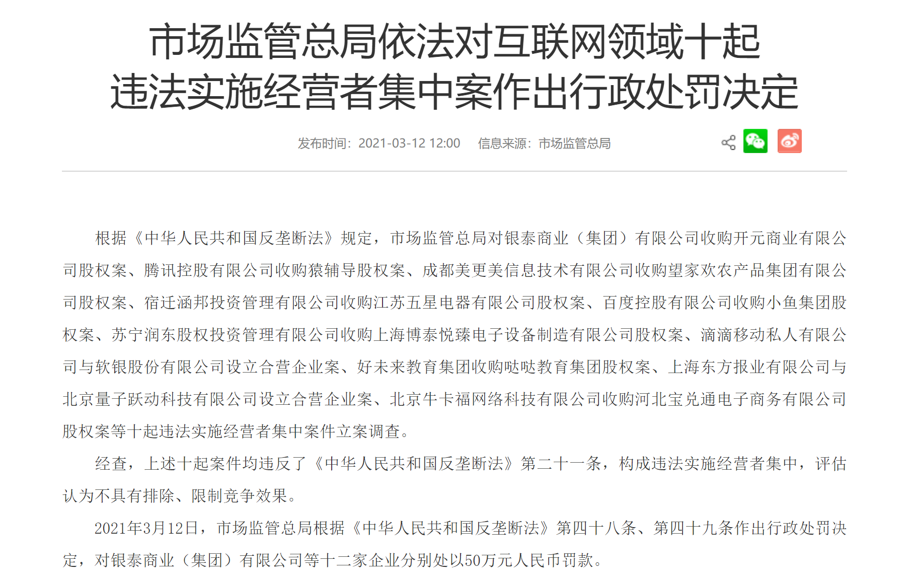 ▲市场监管总局发布对互联网领域十起案件作出行政处罚的决定。图/市场监管总局官网