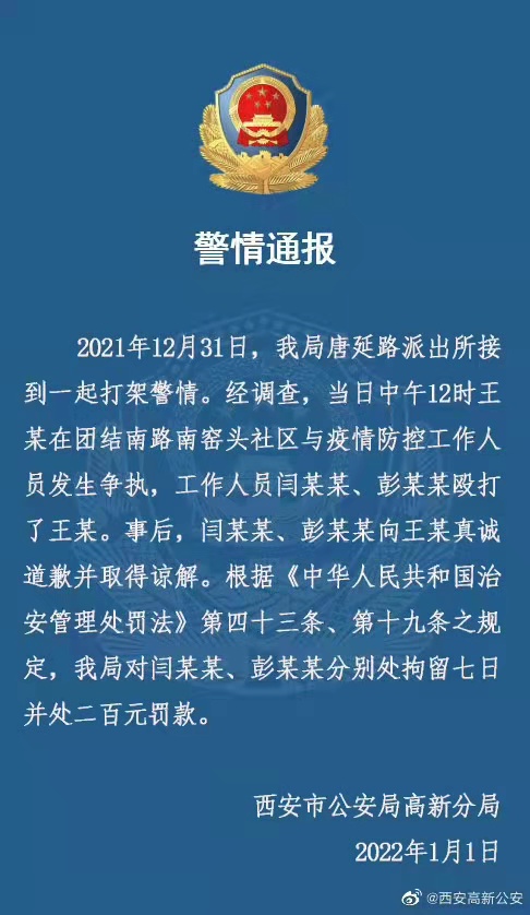 新京报讯(记者 慕宏举 李睿阳 吴梦真)1月1日,西安市公安局高新分局发布一则警情通报。通报显示,2021年12月31日中午12时,王某在团结南路南窑头社区与疫情防控工作人员发生争执,工作人员闫某某、彭某某殴打了王某。事后,闫某某、彭某某向王某真诚道歉并取得谅解。根据《中华人民共和国治安管理处罚法》第四十三条、第十九条之规定,我局对闫某某、彭某某分别处拘留七日并处二百元罚款。
