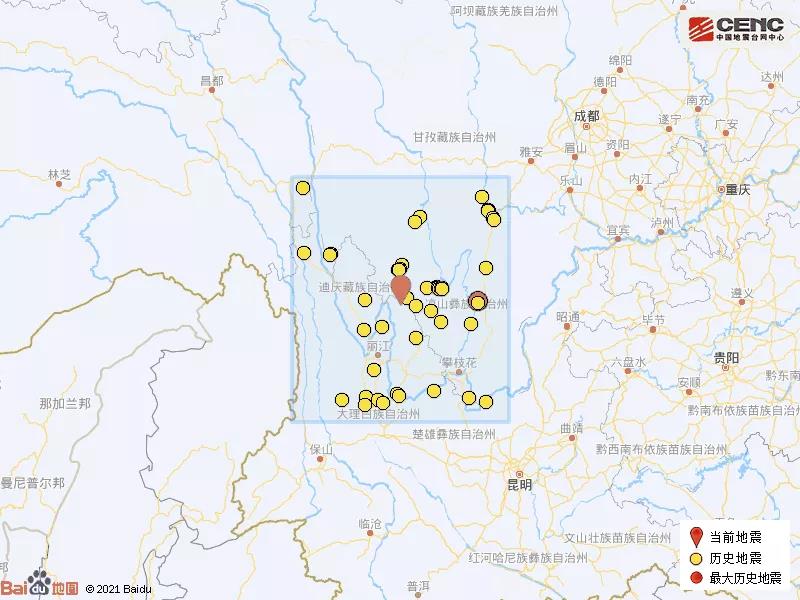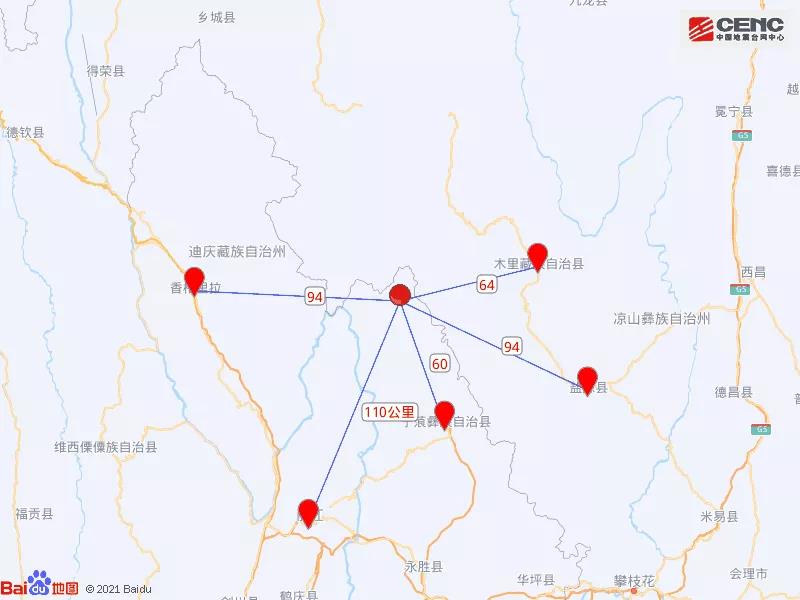 周边县城:震中距宁蒗彝族自治县60公里、距四川木里藏族自治县64公里、距香格里拉市89公里、距四川盐源县94公里、距古城区110公里,距迪庆藏族自治州93公里,距昆明市368公里。