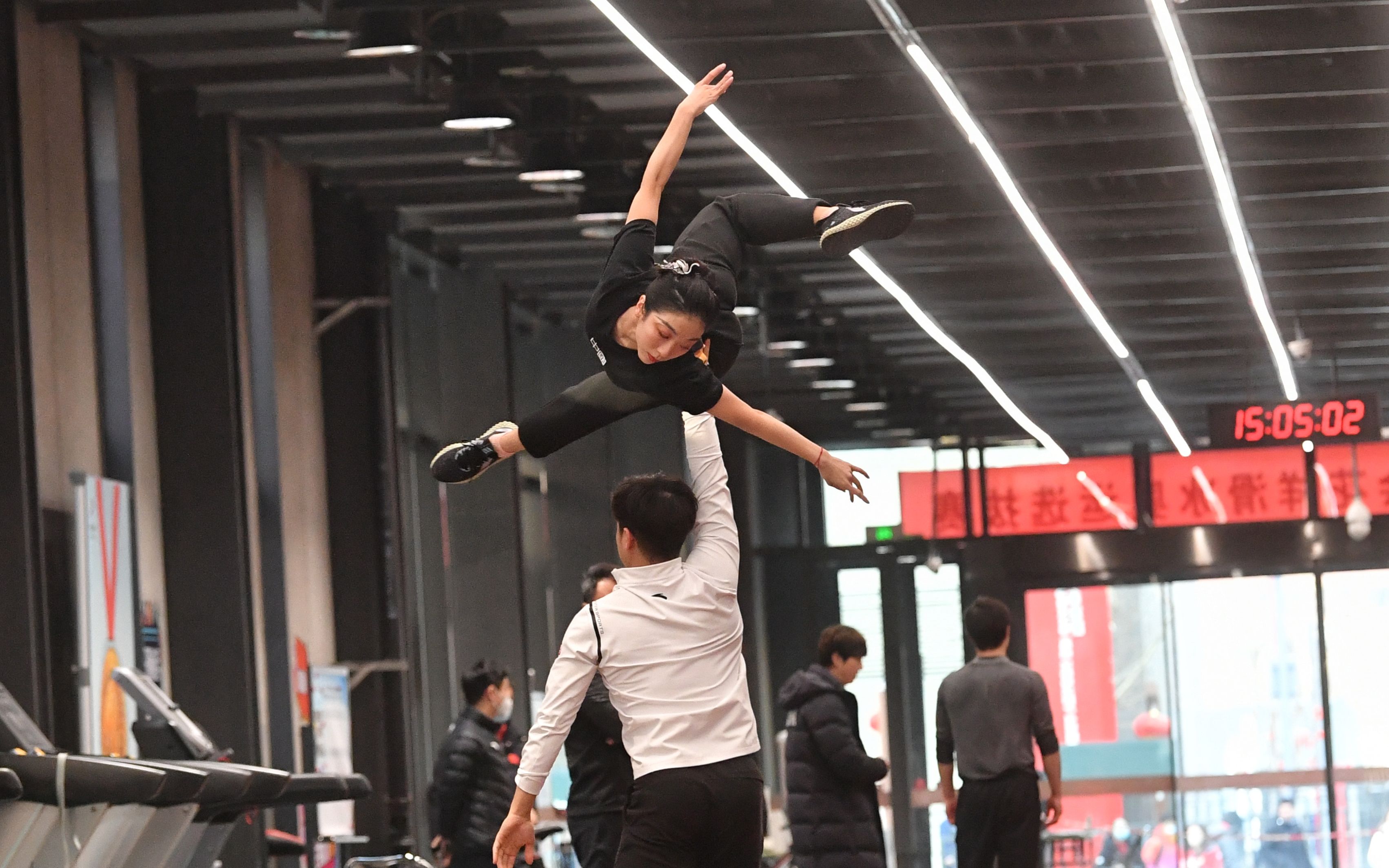 隋文静/韩聪在冰前训练中练习托举。新京报记者 王贵彬 摄