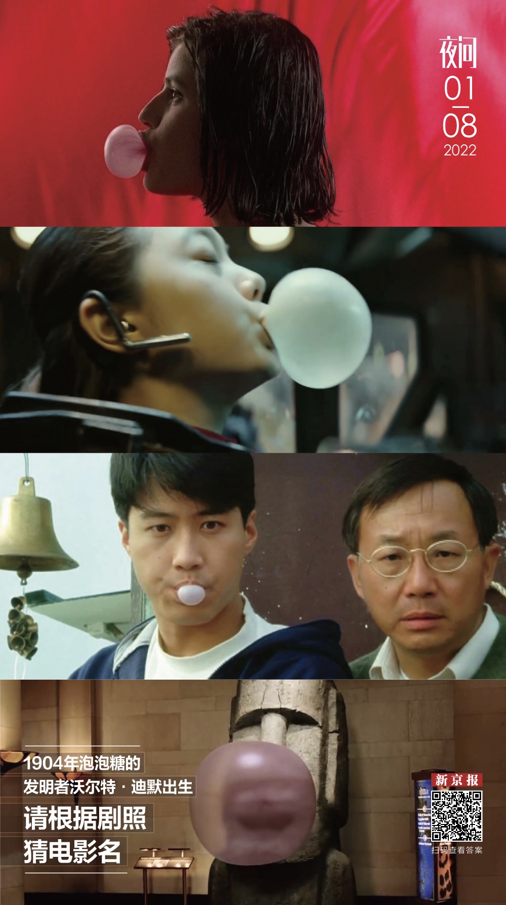 《蓝白红三部曲之红》中女主角吹泡泡糖的画面一直留在观众心里。而电影《神算》里的泡泡糖成为推动情节的重要道具,当反派双方举枪火拼时,黎明饰演的主角吹炸泡泡糖的响声让那些人误以为有人开枪,于是一个泡泡糖解决了好几个反派。在电影《博物馆奇妙夜》里,连活过来的石像也想尝尝泡泡糖的滋味,它与主角围绕泡泡糖进行的一串对话引人发笑。在华语电影《流浪地球》里也有泡泡糖,哪怕人类走向穷途末路时,也有泡泡糖这样廉价却有用的治愈。