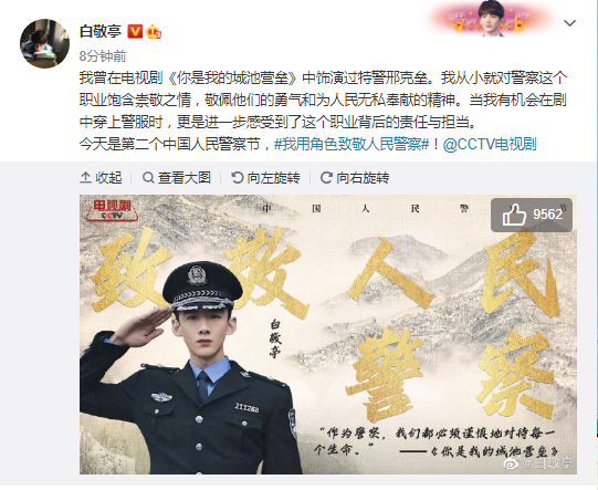 新京报讯 1月10日是中国人民警察节,演员白敬亭在社交媒体上发文,用其在电视剧《你是我的城池营垒》中饰演过的特警角色邢克垒,致敬人民警察。