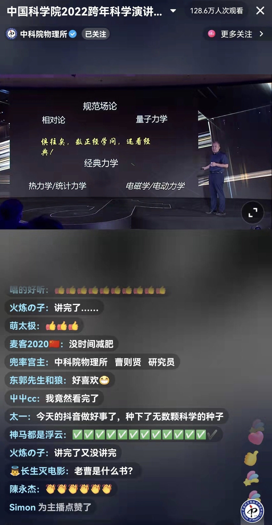 这场晚会,就是抖音联合中国科学院传播局、中科院物理所举办的跨年科学演讲。