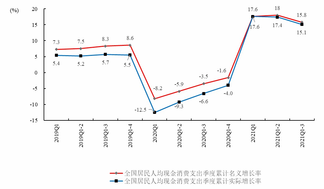 从住户调查提供的全国居民人均现金消费支出看,由于2020年各季累计同比都是负增长,所以2021年各季累计同比增速较高。但是从两年平均增速来看,2021年前三季度全国居民人均现金消费支出名义增速只有5.7%,实际增速3.7%,比疫情前的2019年同期分别低了2.6%和2%。也就是说,和疫情前的正常水平相比,无论是名义增速还是实际增速都比较低,没有恢复到疫情前的水平。