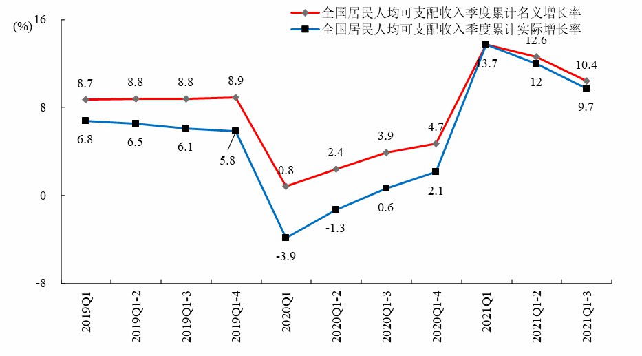 2019年Q1至2021Q1-3全国居民人均可支配收入情况