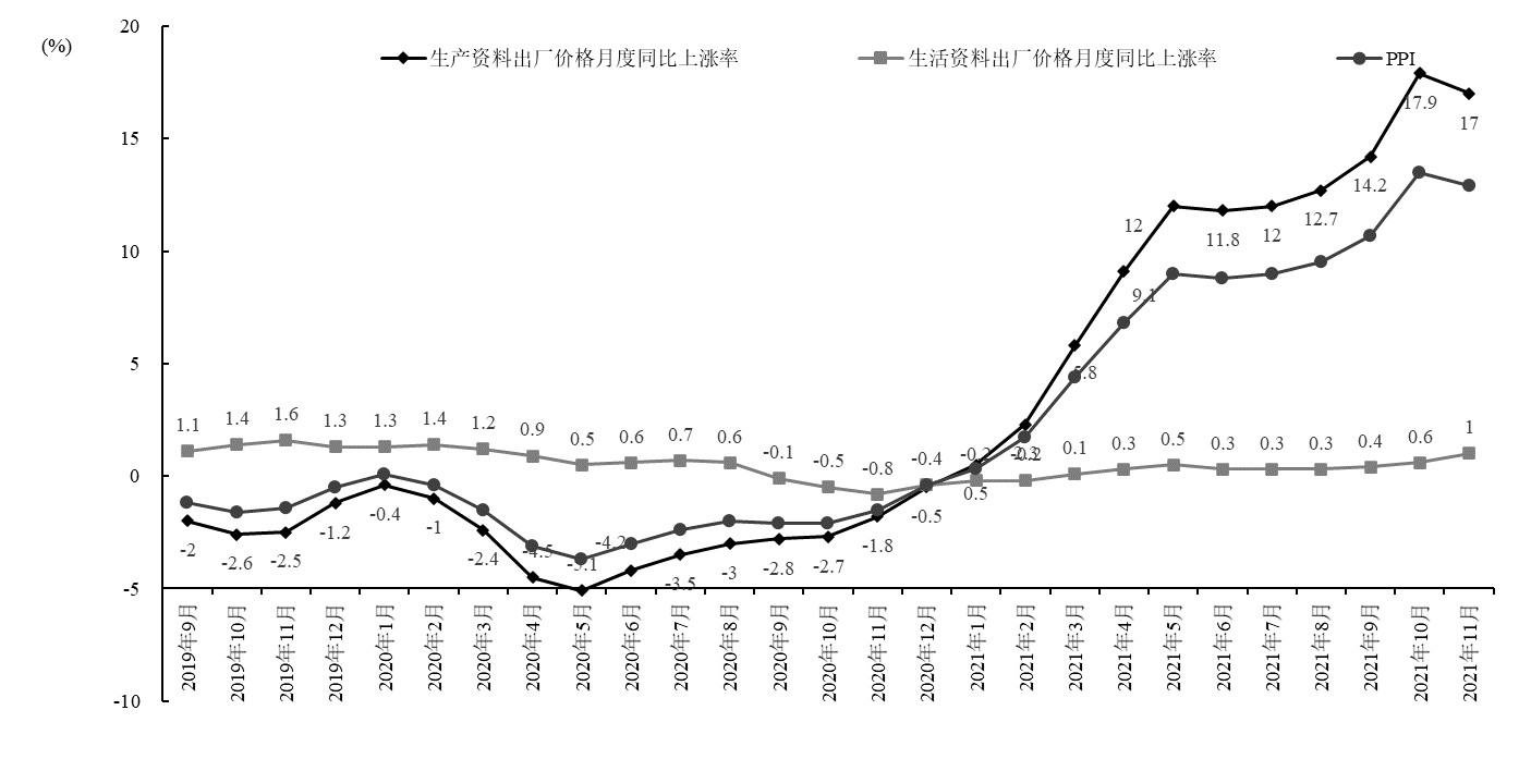 2019年9月至2021年11月生产资料和生活资料出厂价格月度上涨率以及PPI变化