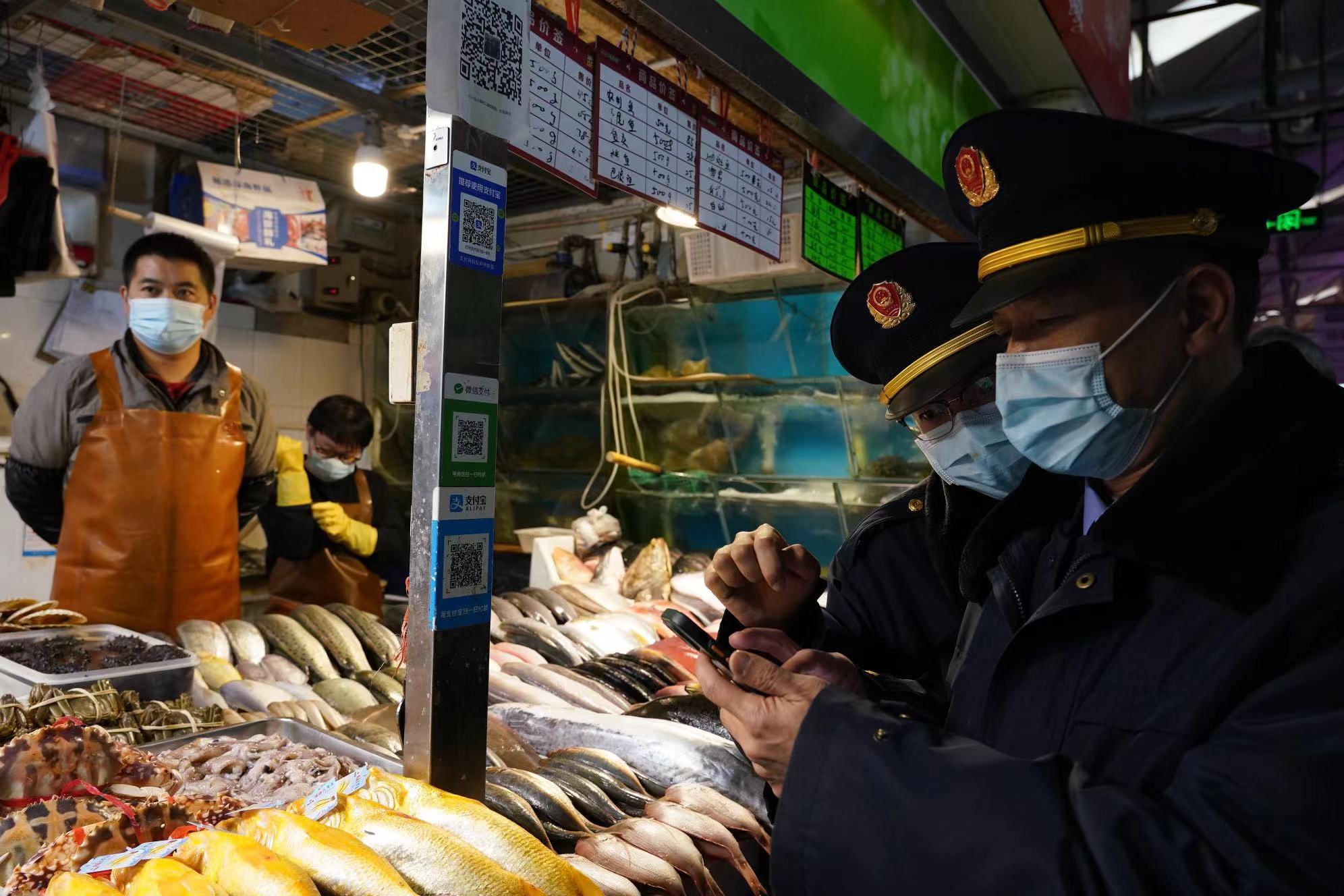 朝阳区市场防疫组的工作人员对三源里菜市场内从事进口海鲜的摊主进行核酸检测。新京报记者 王飞 摄