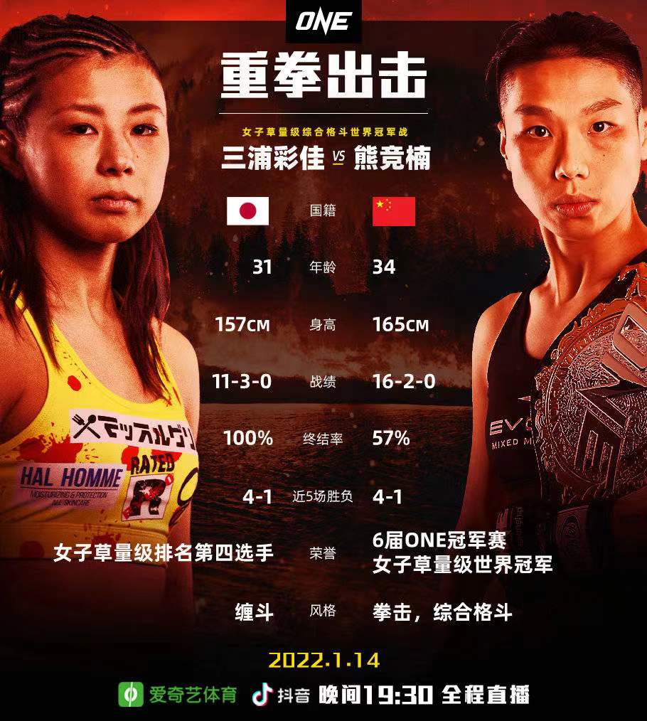 在“ONE:重拳出击”中,中国首位综合格斗世界冠军熊竞楠将进行自己的第6次卫冕战,挑战者是草量级排名第4的日本名将三浦彩佳。作为目前中国在格斗领域唯一一位世界冠军,熊竞楠能否为中国格斗捍卫荣誉在此一战。