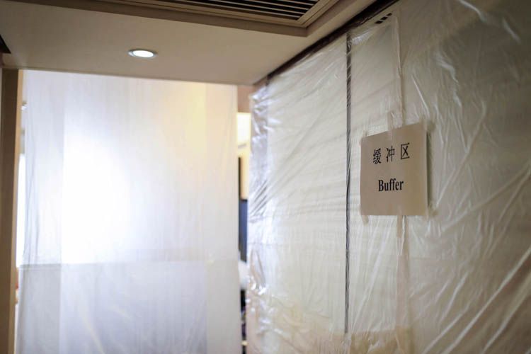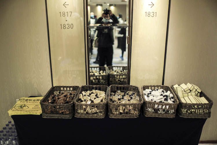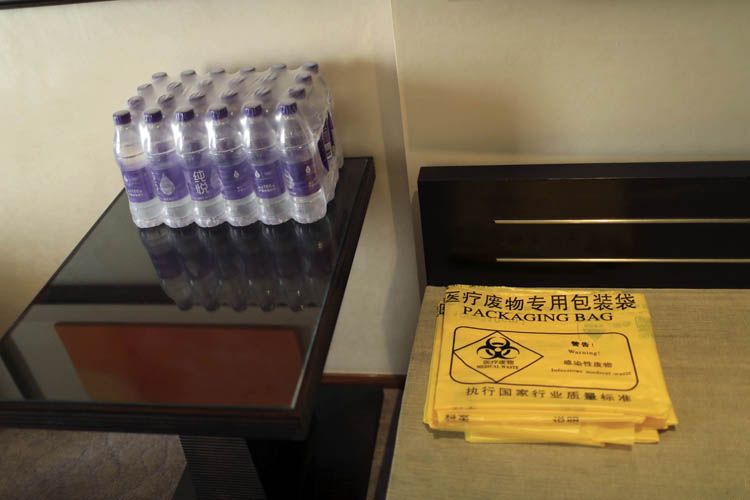 每间客房都放置了整箱矿泉水,所有废弃物都会用专用包装袋运走处理。