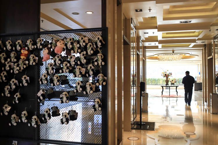 1月14日,北京香格里拉饭店,电梯旁挂着熊猫玩偶。冬奥会期间正值中国传统春节,充满“年味儿”的环境布置让入住宾客感受浓浓暖意。