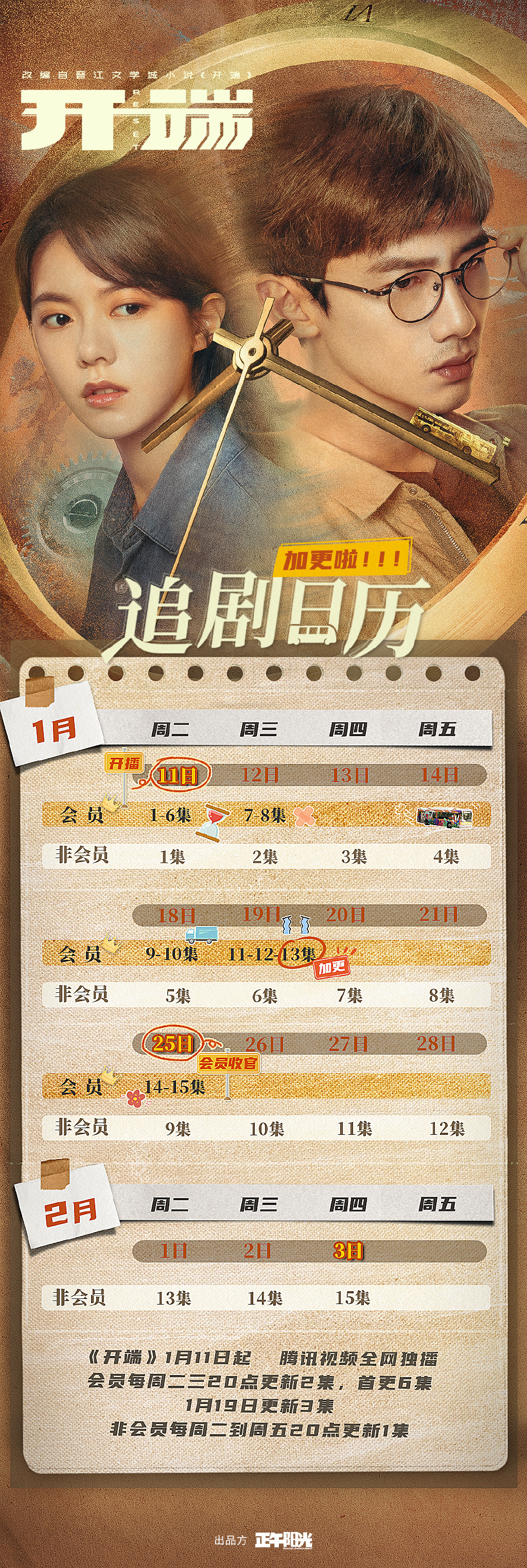 电视剧《开端》由正午阳光出品,改编自晋江文学城祈祷君同名小说,于1月11日起在腾讯视频独播。该剧讲述了游戏架构师肖鹤云(白敬亭饰)和在校大学生李诗情(赵今麦饰)在遭遇公交车爆炸后“死而复生”,于公交车出事的时间段内不断经历时间循环,从下车自救到打破隔阂并肩作战,努力阻止爆炸、寻找真相的故事。