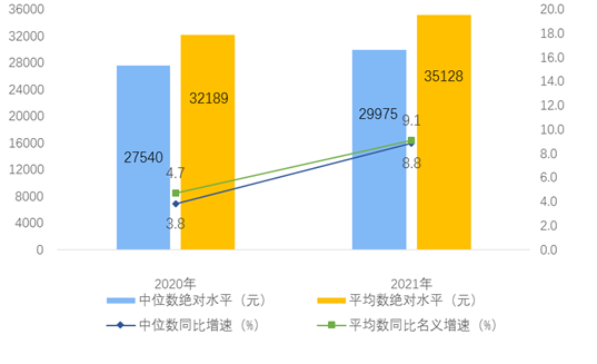 2021年,全国居民人均可支配收入中位数29975元,增长8.8%,中位数是平均数的85.3%。其中,城镇居民人均可支配收入中位数43504元,增长7.7%,中位数是平均数的91.8%;农村居民人均可支配收入中位数16902元,增长11.2%,中位数是平均数的89.3%。