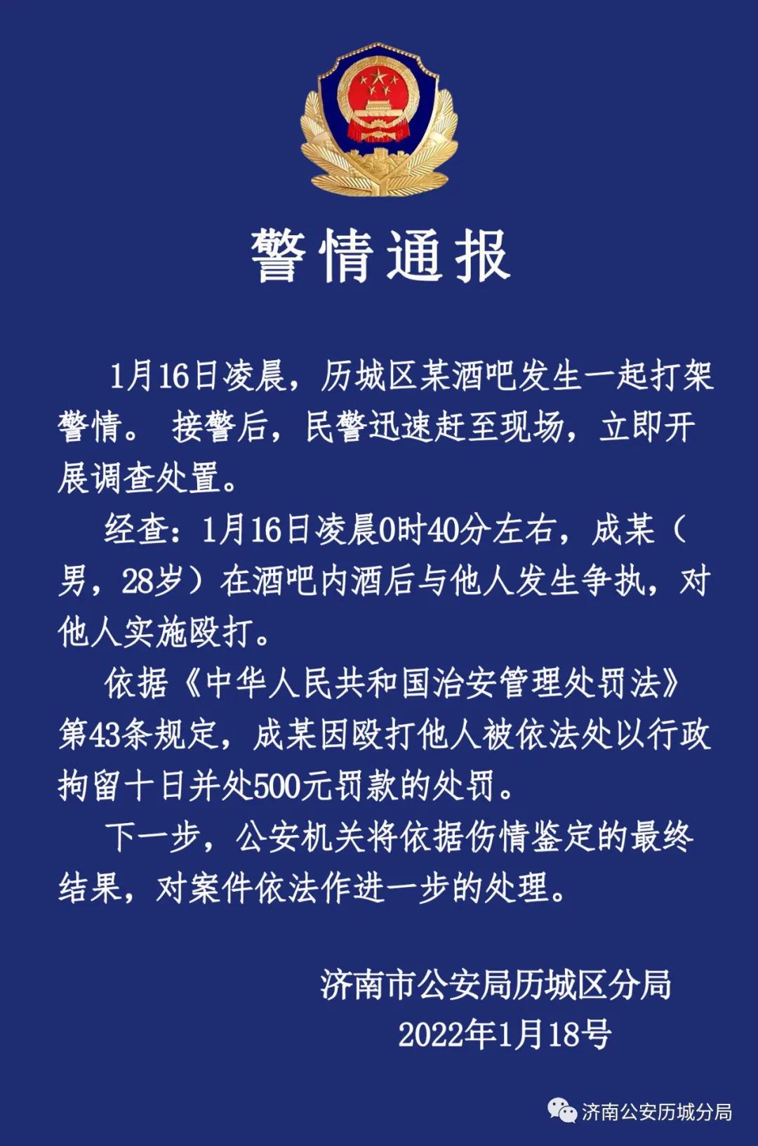 新京报快讯 1月18日,济南公安历城分局发布警情通报,称前山东泰山球员成源酒吧殴打女生,被行拘10日。