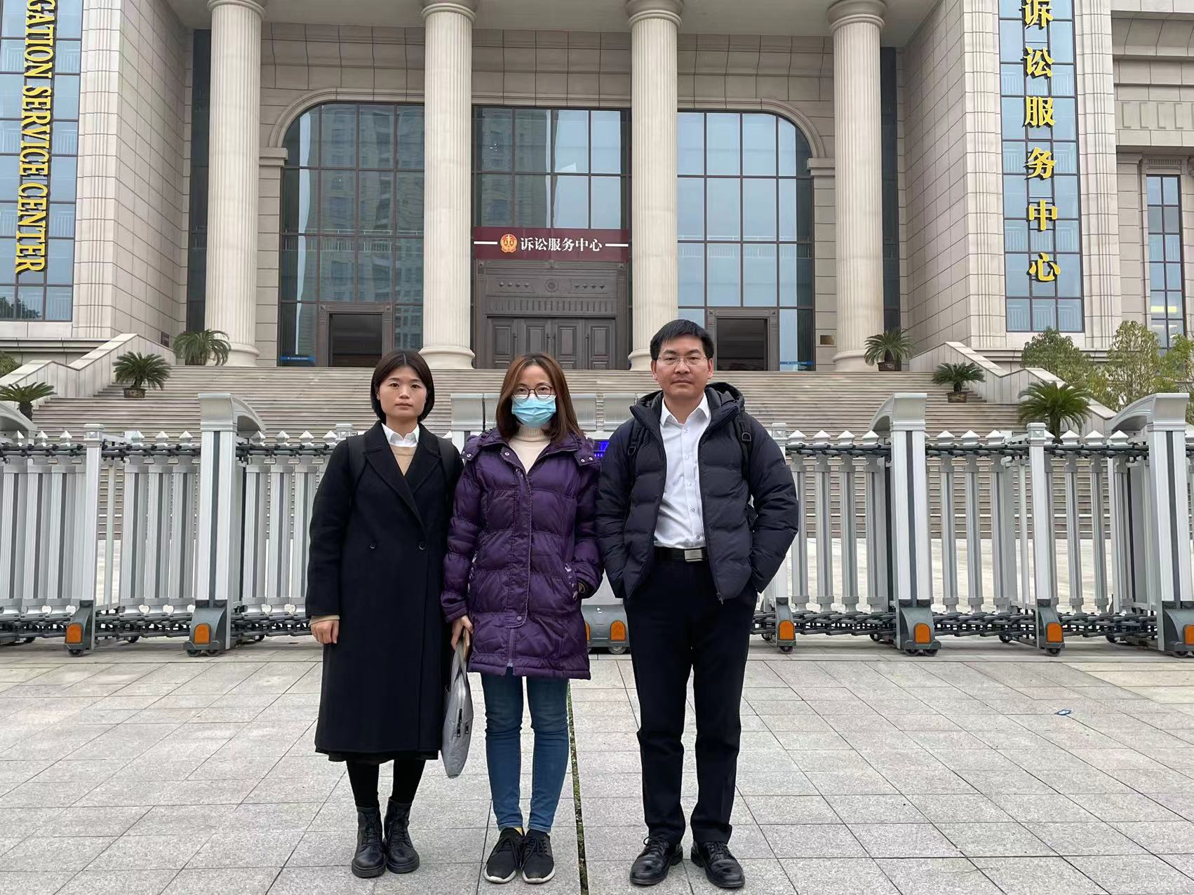 1月18日,汪珍珍(左)和代理律师王飞、张晓丽在江西高院门前合影。受访者供图