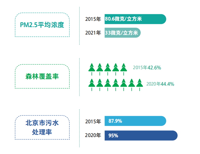 北京的环境方面,2008年北京奥运会改善了生态环境,通过实施14个阶段的大气治理,北京市全年好天气比例从1998年的27.4%上升到2008年的74.9%。北京冬奥会加快生态环境建设步伐,大气、绿化、水环境治理取得显著成效,PM2.5平均浓度由2015年的80.6微克/立方米降至2021年的33微克/立方米。