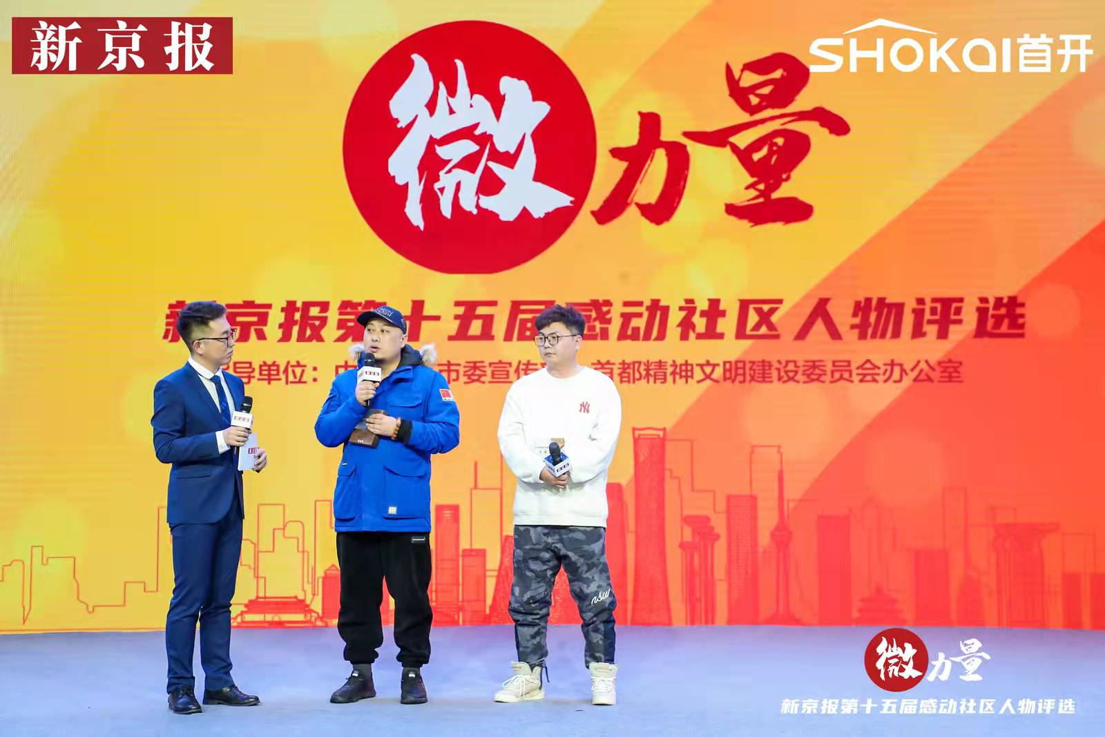 ▲2022年1月19日,在新京报第十五届感动社区人物评选颁奖典礼上,平谷蓝天救援队代表芮革潮(中)接受主持人采访
