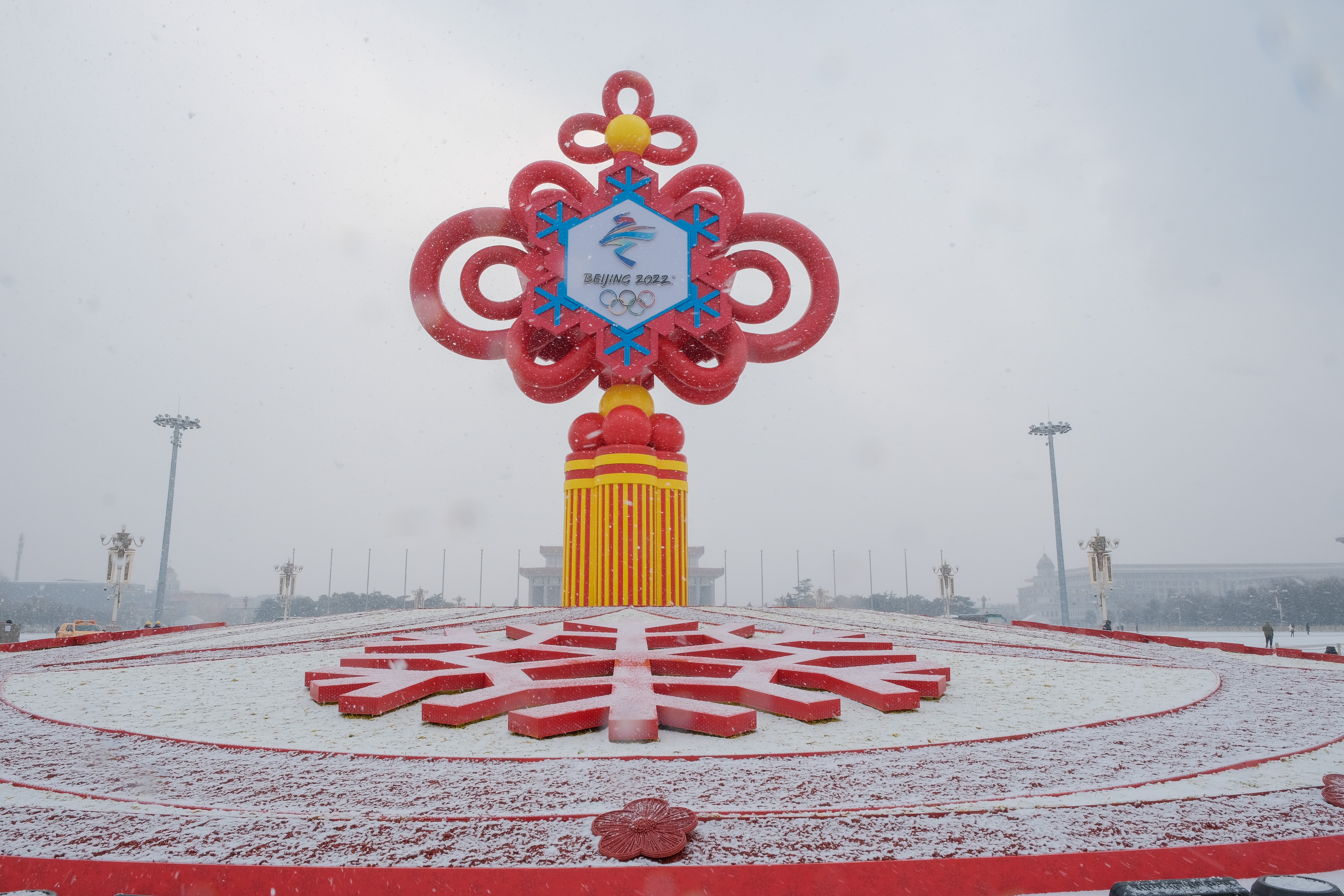 1月20日,天安门广场,雪中的“精彩冬奥”主题花坛。