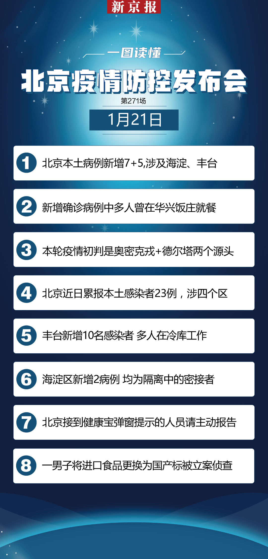 1月21日0时至16时,北京新增7例本土新冠肺炎确诊病例,新增5例无症状感染者。自1月15日至21日16时,北京已报告23例本土感染者,涉及海淀、朝阳、丰台和房山四个区。21日下午,北京召开发布会,介绍相关疫情防控情况。