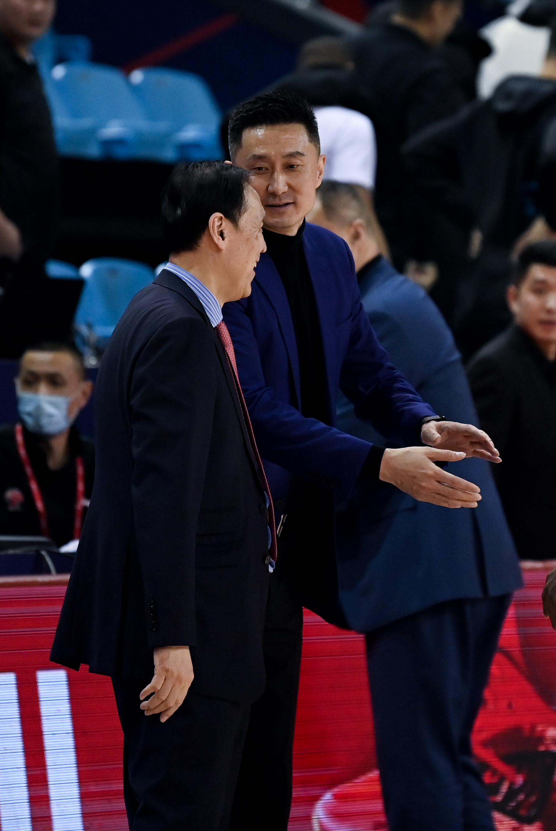 杜锋与天津队主教练张德贵(左)交流。图/新华社