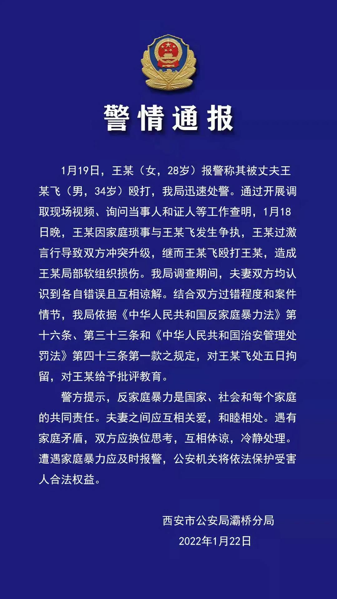 据西安灞桥公安此前通报,王某飞殴打妻子被拘五日,妻子王某被给予批评教育。