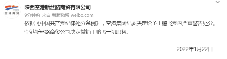 新京报快讯 据@陕西空港新丝路商贸有限公司消息,依据《中国共产党纪律处分条例》,空港集团纪委决定给予王鹏飞党内严重警告处分。空港新丝路商贸公司决定撤销王鹏飞一切职务。