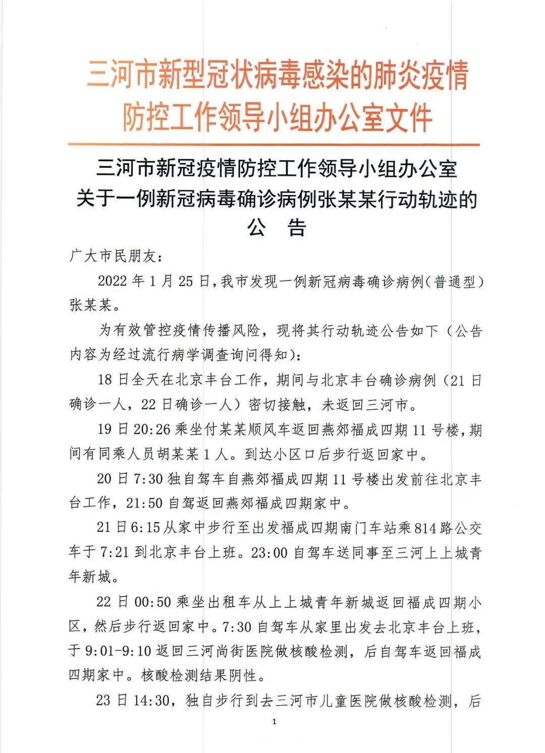 河北三河公布一确诊病例活动轨迹,该病例在北京丰台上班