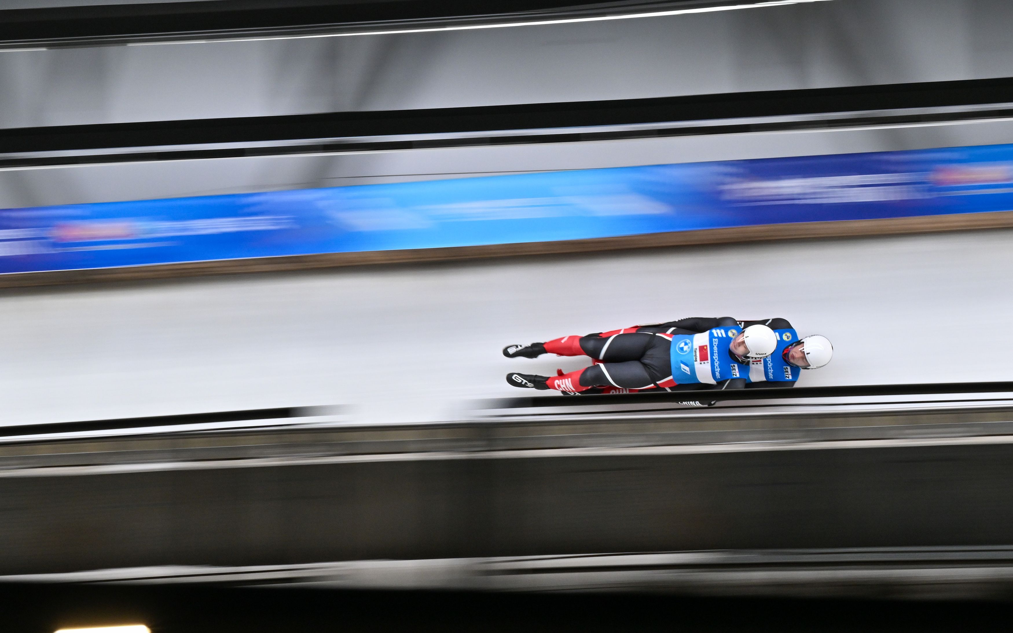 去年11月,“相约北京”雪橇世界杯,中国选手黄叶波/彭俊越在团体接力比赛中。图/新华社