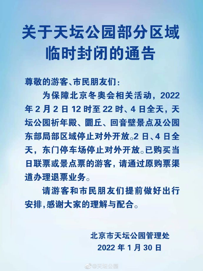 新京报快讯 1月30日,天坛公园发布通告:称2月2日12时至22时、4日全天,天坛公园祈年殿等部分区域停止对外开放。