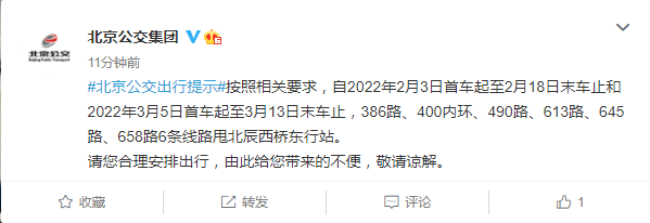 2月3日至18日、3月5日至13日北京6条公交线路实施甩站
