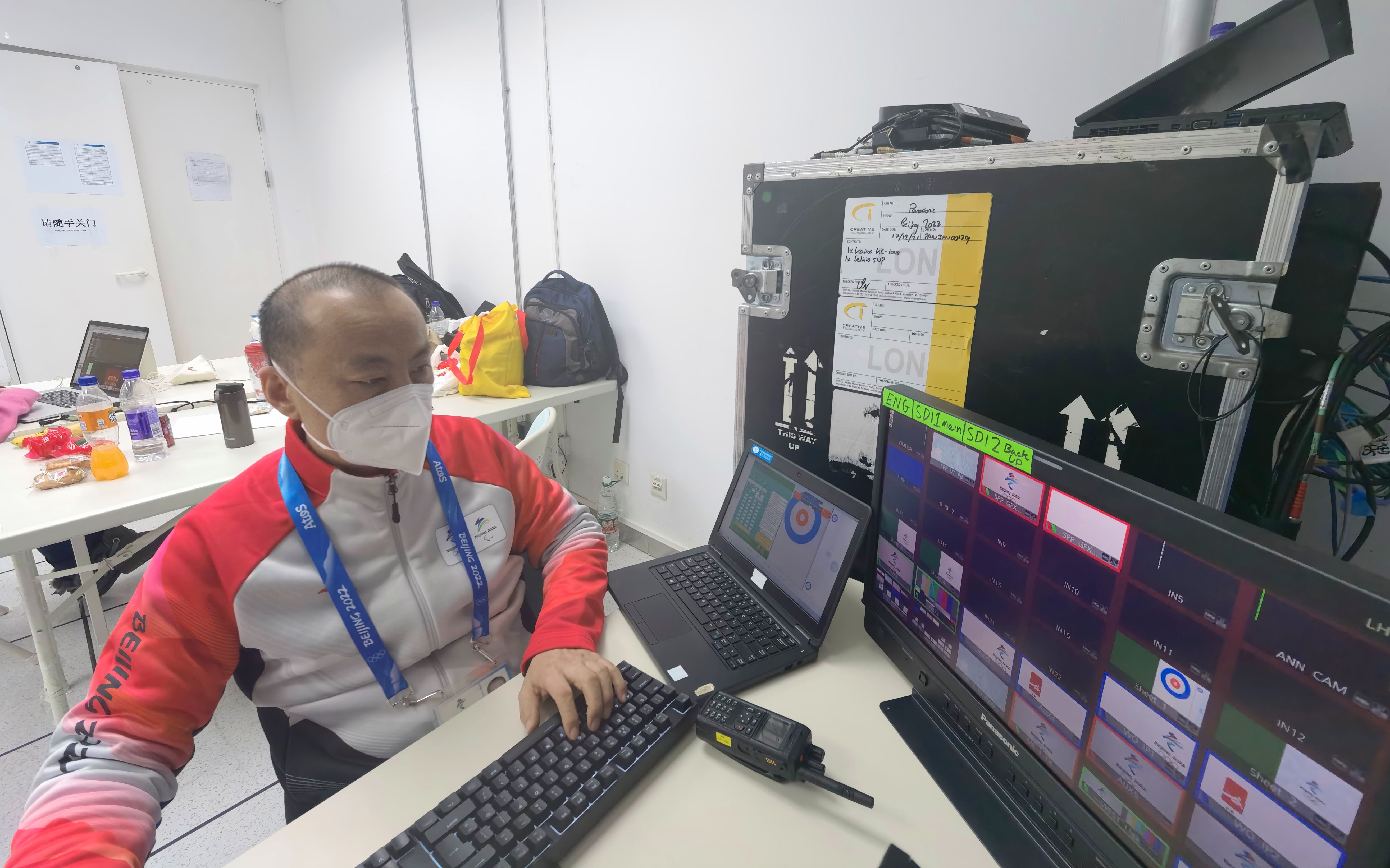 “冰立方”冬奥冰壶赛道旁,孟戈松调试现场大屏幕。受访者供图