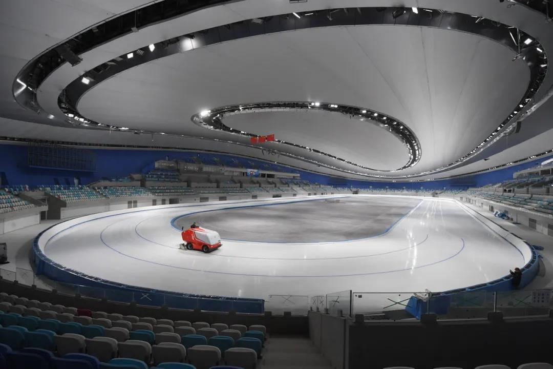 1月22日,北京2022年冬奥会标志性场馆国家速滑馆完成速滑滑冰赛道的首次制冰工作。/IC photo