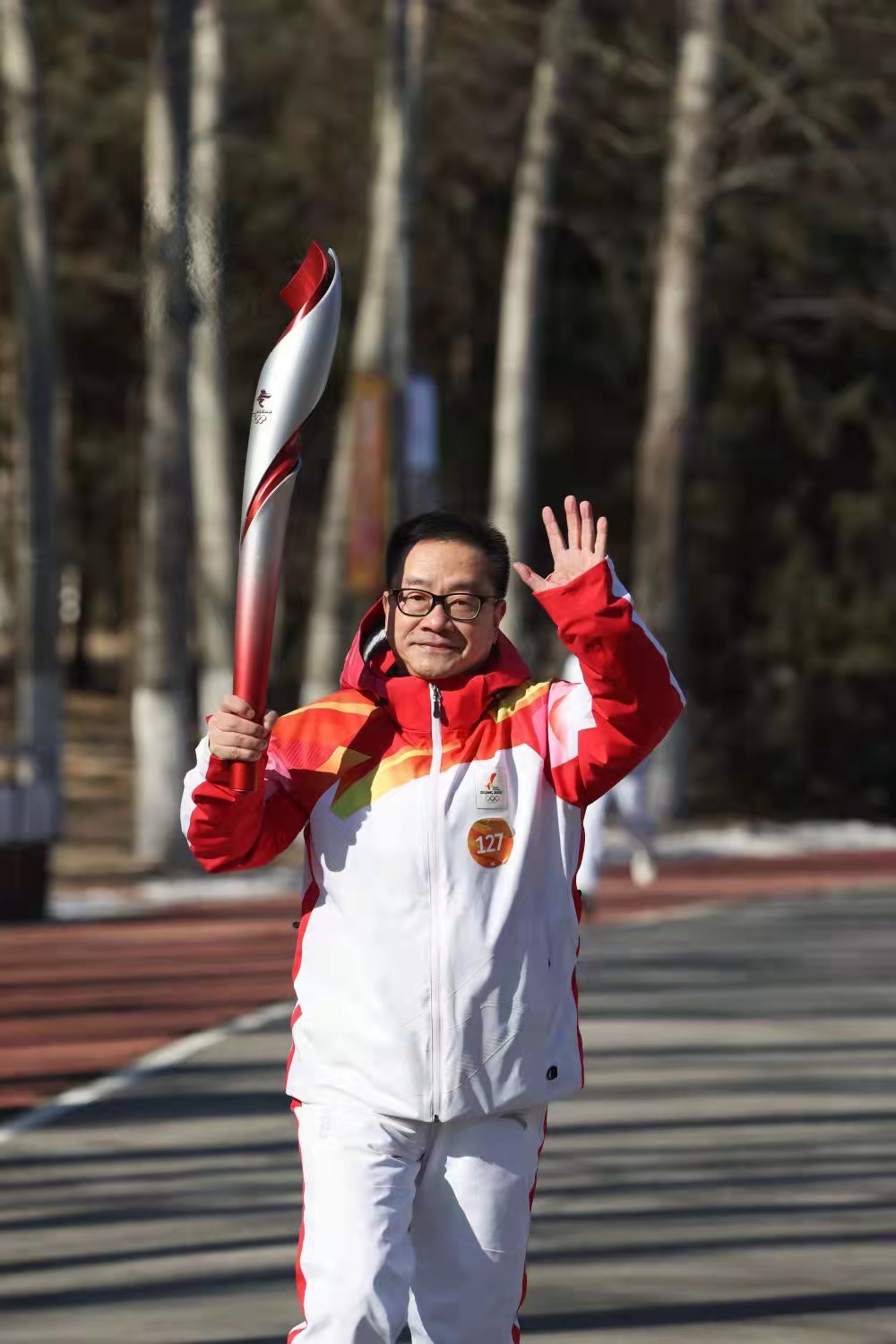 今天上午,北京市朝阳医院副院长童朝晖手持冬奥火炬,在奥林匹克森林公园完成了百米接力。